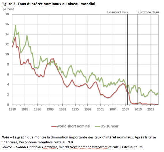 Beaucoup de choses se sont passées depuis 2008. Après la crise des subprime et celle des dettes souveraines en Europe, nous sommes entrés dans un monde inédit de taux d’intérêt bas, dans le monde développé mais aussi dans de nombreuses économies émergentes. Avec des taux aussi faibles, les mécanismes d’équilibrage ont peu d’espace pour fonctionner, car la possibilité de jouer sur les taux d’intérêt nominaux est limitée par la proximité du taux zéro (zero lower bound, ZLB). Précisément, la Figure 2 montre que depuis 2009 les taux d’intérêt nominaux mondiaux sont restés bloqués à un niveau proche du ZLB. Au niveau local, pourtant, l’écart entre l’offre et la demande des réserves de valeur ne s’est pas résorbé.
