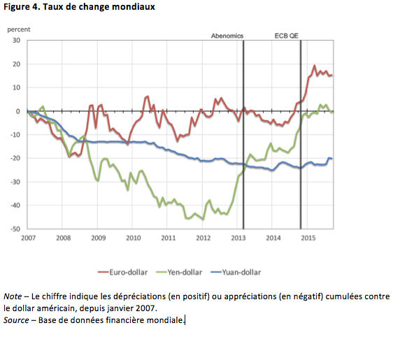 Le 11 août 2015, la Banque centrale de Chine populaire a dévalué le yuan. Certes modeste, cette dévaluation marque un tournant dans la politique chinoise qui consistait jusqu’alors à laisser le yuan s’apprécier ou rester stable face au dollar. Le 22 octobre 2015, Mario Draghi a signalé que la BCE était prête à ajuster « la taille, la composition et la durée » de son programme d’assouplissement quantitatif (QE). En bref, la BCE va bientôt injecter de nouvelles liquidités dans une zone euro qui reste languissante. Première conséquence de cette annonce, l’euro a perdu 1,67% face au dollar. En décembre, la Banque centrale japonaise a déclaré qu’elle allait étendre son programme déjà massif de QE, mettant ainsi  davantage de pression à la baisse sur le yen. Au cours des 24 derniers mois, le dollar est en hausse de près de 10 % contre un panier des principales monnaies de ses partenaires commerciaux. Dans ce contexte, la Réserve fédérale a reporté une fois de plus, lors de sa réunion d’octobre, la « normalisation » de sa politique monétaire – une décision que les observateurs attribuent en partie à l’appréciation du dollar. Bienvenue dans l’économie des taux d’intérêts nuls!