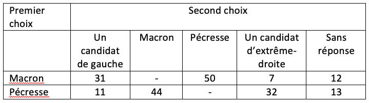 Tableau 3. Second choix de vote au premier tour de l’élection présidentielle des électeurs ayant donné comme premier choix Macron ou Pécresse