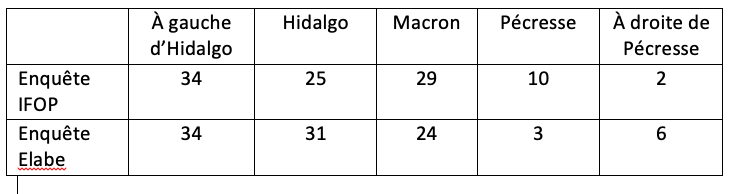 Du point de vue des forces politiques, il est possible de considérer que les électeurs potentiels d’Emmanuel Macron et ceux de Valérie Pécresse constituent respectivement un centre et une droite (tableau 3).