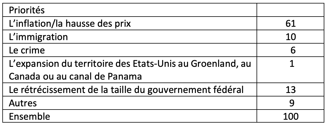 Comment les Américains jugent-ils les premières semaines du gouvernement de Donald Trump ? Un sondage très complet administré par Reuters/Ipsos les 11 et 12 mars nous donne des éléments de réponse très précieux. Dans l’ensemble, le regard des Américains sur l’équipe au pouvoir est assez critique. 44% seulement contre 53% ont une image favorable de Donald Trump, 40% contre 50% de J.D. Vance et 33% contre 59% d’Elon Musk. Concernant les priorités qui devraient être celles du président selon eux, elles laissent présager de grandes difficultés pour le pouvoir dans l’avenir (tableau 1). En effet, l’inflation écrase tous les autres sujets. Or on sait que la hausse des prix a été un élément majeur dans l’élection de Donald Trump alors que sa politique de droits de douane risque fort de la faire repartir.