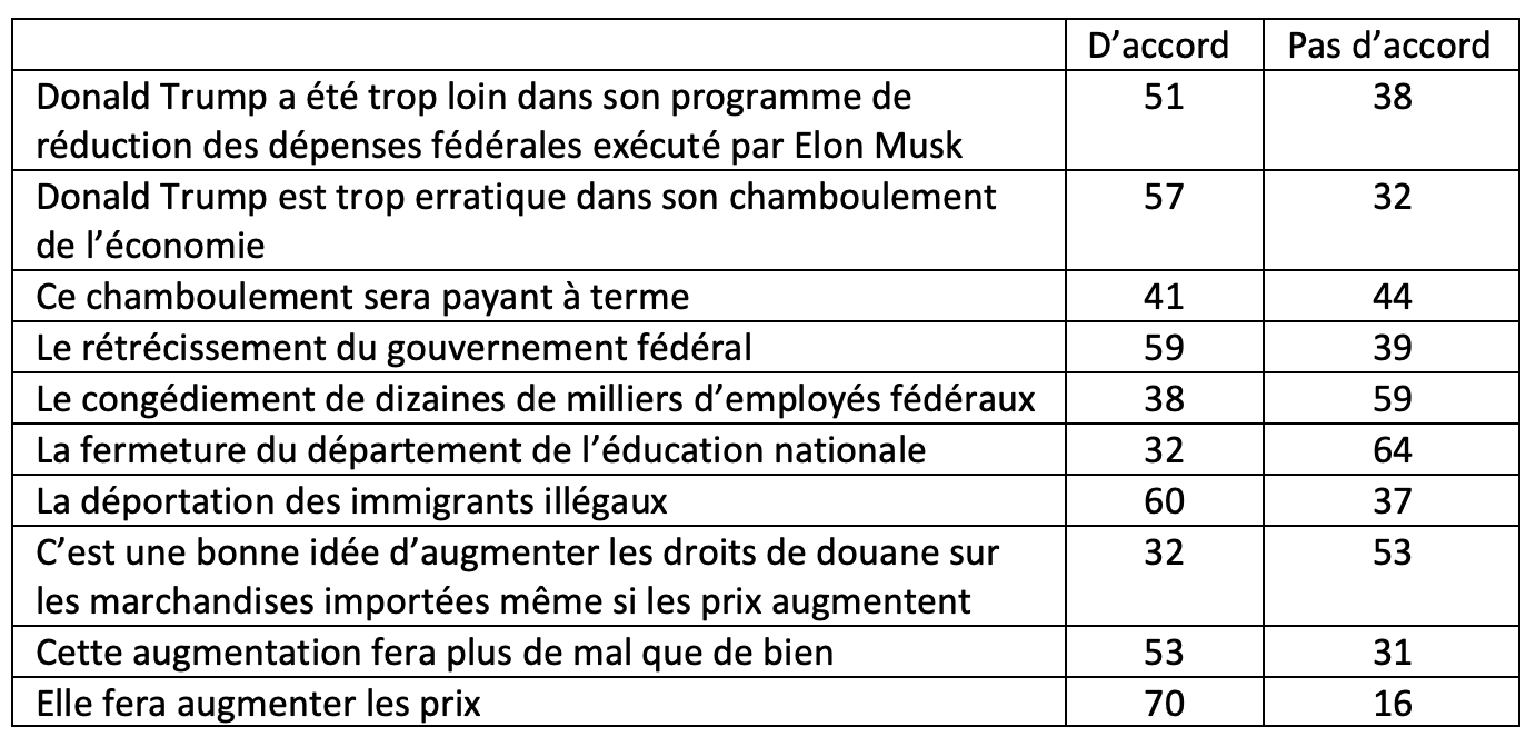 L’enquête teste les opinions des Américains dans trois autres domaines : l’attaque contre l’État fédéral, la question de l’immigration et la politique commerciale (Tableau 4). Trump bénéficie d’un large soutien de l’opinion pour rétrécir la taille du gouvernement fédéral (59% contre 39%). Elle lui reproche en revanche la brutalité avec laquelle cette politique est mise en œuvre par l’équipe au pouvoir, en particulier par Elon Musk. Ils s’opposent notamment au congédiement de dizaines de milliers d’employés fédéraux et à la fermeture du département de l’Éducation. Mais, s’ils critiquent le comportement erratique de Donald Trump dans son chamboulement de l’économie, ils sont partagés sur le fait de savoir si ce chamboulement pourrait être payant dans l’avenir.