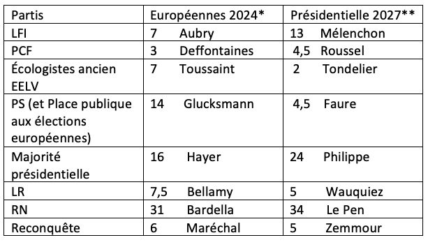 À gauche, la rupture de la Nupes et la stratégie du chaos de Jean-Luc Mélenchon rendent peu vraisemblable une refondation de l’Union. Les intentions de vote aux européennes attestent l’existence d’un électorat de centre-gauche qui, prêt à voter pour un candidat tel que Raphaël Glucksmann, ne l’est pas pour voter pour un socialiste partisan de l’Union de la gauche (tableau). En effet, les intentions de vote à l’élection présidentielle de 2027, à prendre évidemment avec prudence, montrent que Mélenchon domine toujours le paysage politique à gauche et que la rétablir l’union ne pourrait se faire, à cette élection, que par le ralliement des autres forces de gauche à sa candidature, ce qui maintiendrait l’électorat socialiste dans une position marginale comme en 2017 et 2022. Même unis contre Mélenchon, hypothèse hautement improbable, écologistes, communistes et socialistes n’atteindraient pas son score et aucun candidat de gauche ne pourrait très probablement être qualifié pour le second tour. Lorsque Raphaël Glucksmann, déclare, curieusement compte-tenu de sa condamnation de l’extrême-gauche : « on est en train de faire renaître » en France le clivage gauche-droite, qui « n’a jamais disparu à l’échelle européenne », il ne précise pas ce qu’il entend par clivage gauche-droite et oublie notamment qu’au Parlement européen les députés sont élus à la proportionnelle, ce qui permet très souvent des accords entre les deux grands groupes du centre-droit et du centre-gauche, celui du Parti populaire européen et celui, auquel il appartient, de l’Alliance progressiste des Socialistes et Démocrates.