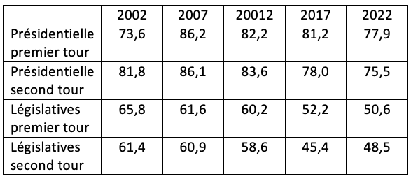 Tableau 2. Participation à l’élection présidentielle et aux élections législatives de 2000 à 2022 (en %)
