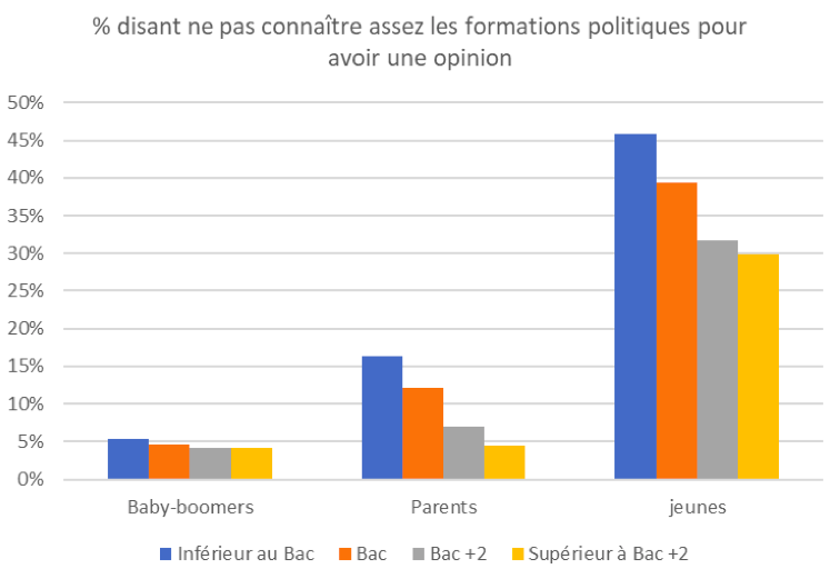 Il y a plusieurs dimensions dans cet éloignement : une dimension de désintérêt (plutôt captée par l’item « ne pas connaître assez les formations politiques pour avoir une opinion ») et une dimension de rejet (plutôt captée par l’item « ne se sentir proche d’aucune formation »). Chez les jeunes, la dimension de désintérêt semble prédominante. La figure 1 montre l’évolution d’une génération à l’autre et par niveaux de diplômes, du pourcentage de répondants qui indiquent « ne pas connaître assez les formations politiques (les principaux partis qui leur sont présentés dans la question) pour avoir une opinion ». On peut en tirer plusieurs enseignements. D’une part, ce pourcentage de personnes éloignées de la politique par méconnaissance ou désintérêt s’accroît d’une génération à l’autre : il est plus élevé dans la génération des parents que dans celle des baby-boomers, et encore plus élevé dans la génération des jeunes. Cela montre qu’il y a bien un effet de génération ou un effet de période dans cette évolution[2]. L’effet d’âge est plausible chez les jeunes (et il joue sans doute en partie), mais il n’y a aucune raison qu’il se manifeste dans la génération des parents (des personnes ayant entre 46 et 56 ans au moment de l’enquête). Le manque d’intérêt pour les questions partisanes semble s’accroître progressivement.