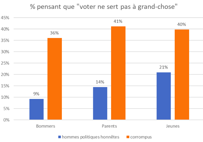 Le discrédit moral dont souffre le système politique est évidemment une première réponse, même si elle est un peu tautologique (les jeunes ne croient plus à la politique parce que la politique n’est plus digne d’être crue). Ce discrédit est massif et général, il touche toutes les générations : 69% des jeunes pensent ainsi que les hommes politiques sont corrompus (plutôt ou tout à fait), 67% des membres de la génération des parents et 56% des boomers. La figure 3 montre l’effet massif qu’exerce ce sentiment de discrédit sur la croyance en l’utilité du vote, un des fondements principaux de nos régimes démocratiques.