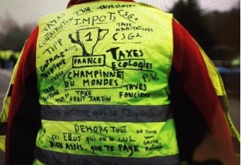 La photo ci-dessous (extraites du site internet de L’Express) de « cet homme qui se révolte », illustre bien ce registre (ce n’est bien sûr qu’un exemple) qui mêle dans la partie supérieure du gilet, un argumentaire sur l’allergie fiscale ou plus largement réglementaire (contrôle technique, PV) à, dans la partie inférieure, un antiparlementarisme virulent : « Dehors tout ces élus qui ont le cul bien assis que je paye ».