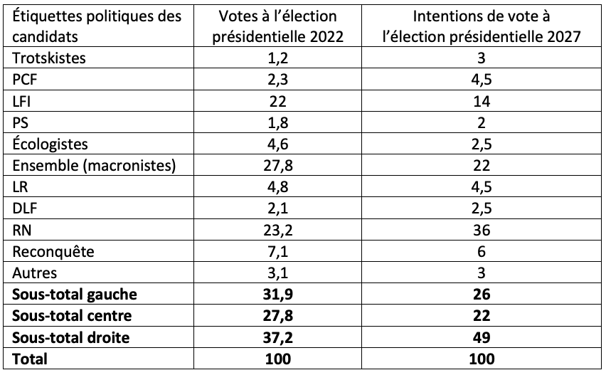Tableau 1. Votes et intentions de vote aux élections présidentielles de 2022 et 2027 (%)