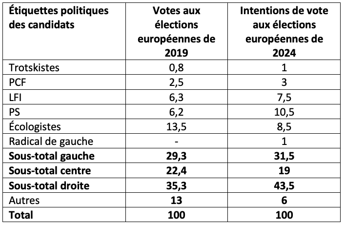 Tableau 2. Vote des électeurs de gauche aux élections européennes de 2019 et intentions de vote aux européennes de 2024 (%)