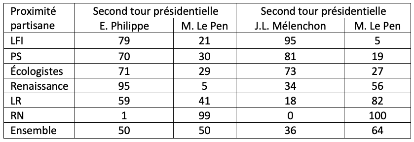 Tableau 3. Intentions de vote exprimées dans deux hypothèses de second tour de la prochaine élection présidentielle selon la proximité partisane (%).