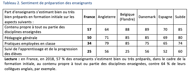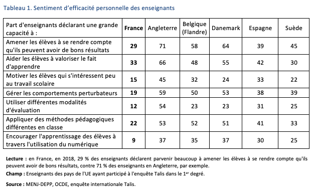 Mais ce qui justifie le titre alarmiste de cette chronique est le fait les enseignants français paraissent se sentir extraordinairement démunis face aux exigences pédagogiques de l’enseignement. Le tableau 1 en dresse un constat assez accablant : ce n’est qu’une petite minorité d’enseignants français qui disent se sentir capables de motiver leurs élèves, de conforter ceux qui ont des difficultés, de les accompagner vers la réussite, de varier les méthodes pédagogiques, et de contrôler lorsque c’est nécessaire les comportements perturbateurs. Le contraste avec les réponses des enseignants des autres pays de l’UE interrogés, beaucoup plus optimistes sur l’efficacité de leurs pratiques pédagogiques, est frappant.  La part des professeurs qui encouragent leurs élèves à utiliser le numérique dans leurs apprentissages est également incroyablement faible (9%), alors que c’est le cas en moyenne d’un enseignant sur trois dans les autres pays européens.