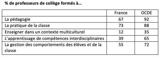Le tableau ci-dessous synthétise quelques résultats montrant le retard français en matière de formation pédagogique, de gestion des classes et de savoir-faire concernant le comportement des élèves et de méthodes pédagogiques transversales.