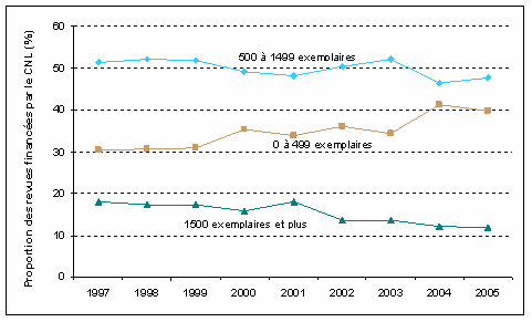 Répartition des 1100 revues ayant demandé une aide au CNL entre 1997 et 2005 selon leur tirage : croissance de la proportion de revues à faible tirage