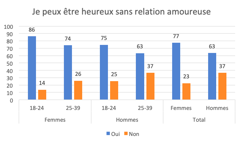 L’image de la vie à deux perdure comme un projet positif, gage d’épanouissement, mais elle mérite d’être rapprochée d’une autre donnée significative : on peut vivre heureux sans relation amoureuse à tous les âges de la vie, et ce encore plus chez les 18-24 ans (82%), ce qui n’est pas trop surprenant pour cet âge, mais ce chiffre demeure élevé pour les classes d’âge suivantes : 25-39 ans (70%), 39-54 ans (64%), + de 55 ans (63%). Les nouvelles générations se révèlent ainsi moins sentimentales que leurs aînées. Contrairement à l’idée répandue selon laquelle la fidélité est tournée en valeur cardinale pour les nouveaux couples, cette exigence est relativisée : elle est certes portée au pinacle pour les plus jeunes (64% de réponses positives), mais cette exigence faiblit, autour de 50% de réponses positives après 25 ans, avec toutefois une note générationnelle : on en discute et on ne fait rien « en douce ». De fait les femmes expriment plus nettement que les hommes ce relatif détachement à l’égard de l’expérience amoureuse, et ce quel que soit leur âge. Cette différence existe même à l’âge de la procréation : pour 74% des femmes de 25-39 ans la relation amoureuse n’est pas indispensable pour être heureux, un chiffre plus élevé que celui des hommes du même âge (63%).