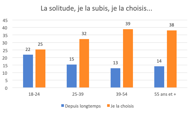 La mise à distance de la relation amoureuse est confirmée par la prise de position des différentes générations à l’égard de la solitude. Beaucoup de jeunes disent ressentir la solitude de temps en temps (39% des 18-24 ans et 33% des 25-39 ans), mais la vraie solitude, celle que l’on subit depuis longtemps, cette détresse qui fait que l’on se sent seul parmi les autres, cet abime contemporain qu’a étudié le psychologue Sébastien Dupont[5] n’est mentionnée que par un cinquième des répondants de 18-24 ans et par 15% des 25-39 ans. En revanche, désigner la solitude comme un choix délibéré est plus fréquent, comme l’indiquent 25% des 18-34 ans, 32% des 24-39 ans, 39% des 40-54 ans, et 38% des plus de 55 ans, sans grande distinction selon le genre.