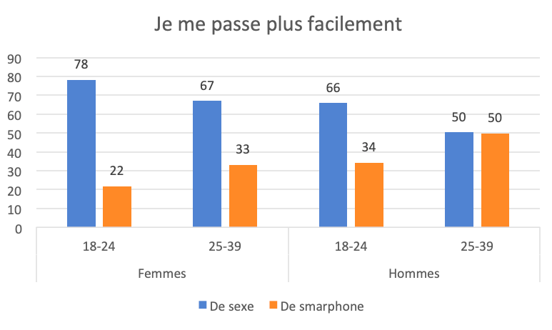 L’examen de la sexualité des nouvelles générations réserve d’autre surprises. La place qu’elle occupe, la façon dont elle est abordée, se révèlent en décalage avec l’acception épanouissante et décomplexée qui a prévalu dans le sillage des années de la libération sexuelle. Ainsi, même s’il s’agit d’une réponse sous forme de boutade à une question clin d’œil, une majorité des 18-24 ans et des 25-39 ans déclarent se passer plus facilement de sexe que de smartphone. Cette affirmation relève d’abord des jeunes femmes, premières utilisatrices des outils conversationnels offerts par le numérique, mais les jeunes hommes abondent aussi dans ce sens. Cette curieuse pondération signe sans doute avant tout la dépendance des vingtenaires et des trentenaires à l’égard des nouveaux outils de communication, mais elle relègue aussi la sexualité à une place presque secondaire : en termes de dopamine, la navigation sur Internet procurerait des satisfactions supérieures. D’autre part, la vie sexuelle est présentée assez souvent comme une contrainte : ainsi nombreuses sont les femmes à déclarer se forcer parfois ou souvent à faire l’amour : 40% des femmes de 18-24 ans et 49% des femmes de 25-39 ans. Sur l’autel de la sexualité, les hommes semblent plus enclins à faire prévaloir leur envie, et se placent rarement sous la contrainte. Sans que ce soit réellement une surprise, cette dissymétrie étayée depuis longtemps par les travaux sur la sexualité n’a pas du tout disparu à une époque où l’égalité des genres est proclamée partout.