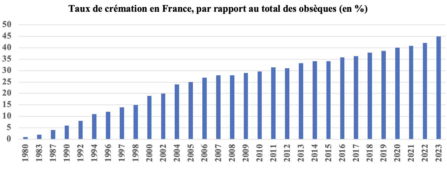 La crémation a concerné, en 2007, 28% des obsèques, 36% en 2016, 45% en 2023. La courbe de progression, par rapport à l’inhumation, est éclatante : 1% de croissance en moyenne chaque année. De telles évolutions sociodémographiques, avec un profil aussi net, nourrissant des courbes à tendance presque parfaitement linéaire, sont rares.