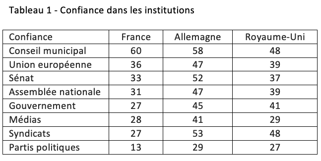 La défiance ne s’applique pas qu’aux relations interpersonnelles. Elle concerne l’ensemble des institutions, à l’exception des collectivités locales, et non pas seulement le pouvoir exécutif (tableau1), ce qui nous différencie de l’Allemagne et pour partie du Royaume-Uni. C’est l’expression d’une défiance générale à l’égard des institutions