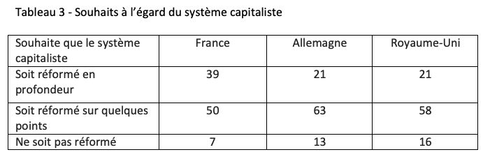 Une partie de la réponse doit être recherchée dans la culture politique d’une large partie de la population française qui s’irrigue à cette défiance ancestrale à l’égard de la réussite économique et de l’argent que nous évoquions au début de ce papier et qui s’est muée aujourd’hui en un antilibéralisme économique, largement partagé par les organisations politiques elles-mêmes. Deux éléments le montrent. Le premier concerne les attitudes à l’égard du capitalisme. 39% des Français souhaitent que le système capitaliste soit réformé en profondeur (tableau 3). Ils ne sont que 21% dans ce cas en Allemagne et au Royaume-Uni. Cette attitude, largement répandue chez les Français que le capitalisme est responsable de leurs difficultés économiques, peut alimenter leur défiance à l’égard du système.