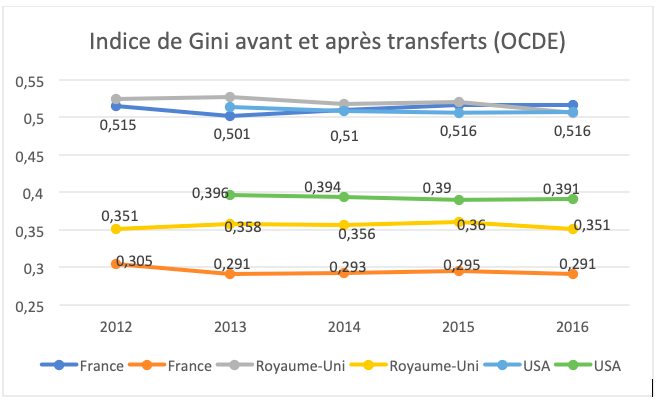 Il y a sans doute une double motivation dans cette revendication : d’une part, un sentiment de justice, d’autre part l’idée beaucoup plus contestable que « faire payer les riches » permettra de résoudre les problèmes de la France – étendre les services publics et redistribuer l’argent public au bénéfice des Français modestes. Ce n’est évidemment pas le principe de la redistribution qui est contestable – il est d’ailleurs mis en œuvre dans tous les pays développés à des degrés variables – c’est précisément le fait que ce degré est déjà très élevé en France, un des pays du monde où les inégalités de revenu primaire sont les plus fortement compensées par l’État social. Il est donc probablement difficile d’aller beaucoup plus loin. Comme le montre la figure ci-dessous, l’inégalité avant transferts (mesurée par l’indice de Gini) est aussi élevée en France qu’au Royaume-Uni et aux États-Unis, deux pays réputés inégalitaires. Mais le tableau est tout différent après transferts : la correction apportée par les transferts sociaux réduit très fortement les inégalités dans notre pays, et le rapproche des pays égalitaires : en 2016, l’indice de Gini est ainsi de 0,291 en France, pas très éloigné de l’indice suédois (0,282).