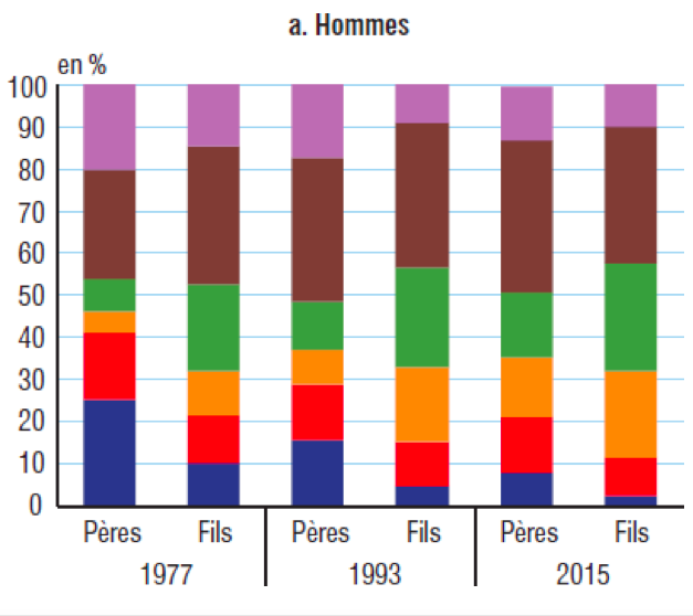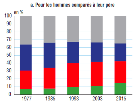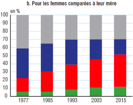 En 2015, les deux tiers des hommes âgés de 35 à 59 ans appartiennent à une catégorie sociale différente de celle de leur père. La mobilité sociale des femmes est encore plus élevée (71% par rapport à leur mère) et surtout a progressé très rapidement (alors que celle des hommes a stagné) : 12 points de plus par rapport à leur mère, 6 points de plus par rapport à leur père.
