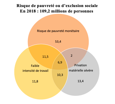Il apparaît clairement, avec un graphique en cercles, ce que sont les points de recoupement entre les trois critères de l’approche européenne. Le graphique montre comment le taux de risque de pauvreté ou d’exclusion sociale se répartit entre les trois indicateurs qui le composent et comment ceux-ci se recoupent partiellement. On voit dès lors bien la différence entre une vision inclusive des trois dimensions, ce qui conduit, en 2018, à 109,2 millions de personnes à risque de pauvreté ou d’exclusion sociale, et une vision cumulative dans laquelle 6,9 millions de personnes sont concernées. Une grande question des politiques de lutte contre la pauvreté consiste à savoir ce qu’il faut cibler : la pauvreté dans des contours élargis (avec union des trois critères choisis), ou bien la pauvreté extrême, qui cumule les différents problèmes (à l’intersection des trois critères).
