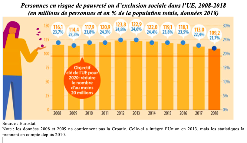 Ces considérations techniques rappelées, que s’est-il passé sur le temps de la stratégie UE 2020 ? Sur un simple plan de suivi statistique, Eurostat a publié fin 2019 les données pour 2018, ce qui permet un regard solide sur la décennie, qui avait débuté avec des chiffres 2008. L’institut statistique souligne une tendance à la baisse pour la proportion de personnes menacées de pauvreté ou d'exclusion sociale dans l'Union. Mais, en 2018, ce sont toujours 109 millions de personnes, soit 22% de la population de l’Union. Après trois années consécutives de hausse entre 2009 et 2012 pour atteindre près de 25%, la proportion de personnes ainsi affectées dans l’Union a depuis continuellement baissé pour s'établir à 21,7% en 2018. Malgré cette baisse depuis le pic en 2012 (124 millions de personnes), 8 millions de personnes seulement (y compris la Croatie) ont été sorties du risque de pauvreté ou d’exclusion sociale par rapport au niveau de référence 2008 (116 millions hors Croatie). Ce nombre reste loin de l’objectif UE 2020 de faire sortir 20 millions de personnes de la pauvreté. Notons que c’est sur ce volet de la pauvreté que la stratégie UE 2020 semble le plus à la peine.