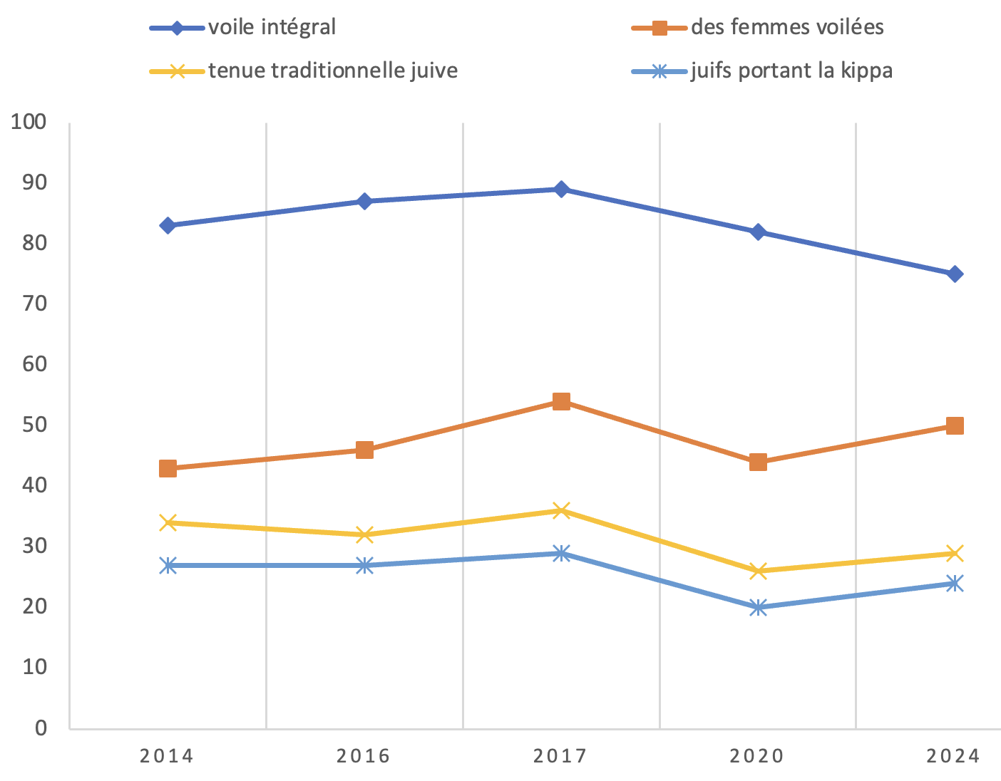 Figure 2. L’attitude des Français à l’égard des tenues religieuses (IPSOS CRIF 2024). Pourcentage d’attitudes « inquiété ou agacé »