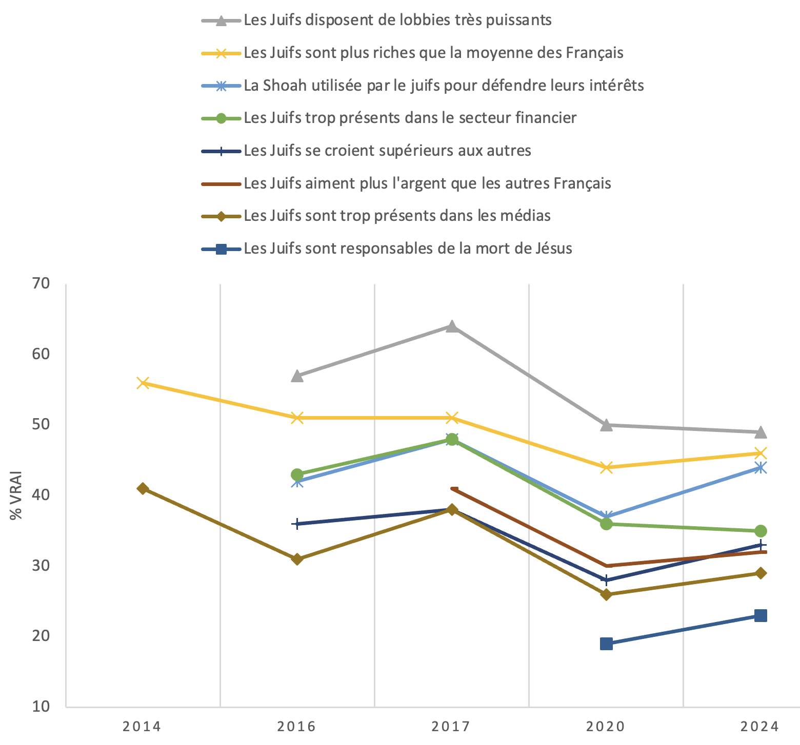 L’adhésion aux préjugés antisémites – l’idée que les juifs forment un groupe dominateur et soudé qui cherche à faire prévaloir ses intérêts à l’aide l’argent, des médias, de lobbys puissants, d’une manipulation morale de la Shoah – reste à un niveau très élevé. La moitié des Français par exemple adhèrent à cette idée du « lobby juif ». Par comparaison le vieil antisémitisme chrétien (les juifs responsables de la mort de Jésus) est devenu résiduel.
