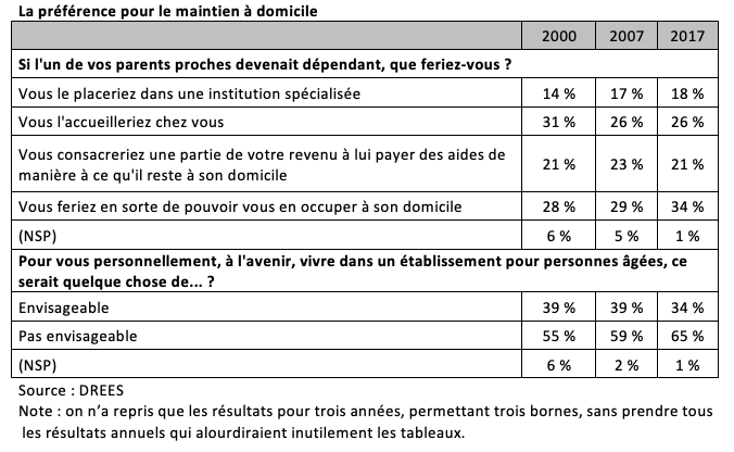 Ces résultats sont largement corroborés par d’autres sondages ou d’autres informations tirées par exemple de la concertation conduite entre 2018 et 2019. Il ressort que l’entrée en établissement se vit comme un déracinement, une rupture difficile à vivre sur bien des plans, avec des conséquences d’ailleurs problématiques sur l’état de la personne ainsi nouvellement logée. Maintenir à domicile c’est une façon de préserver, jusqu’au bout, si cela peut être rendu possible, un environnement fait de souvenirs, de conditions de vie jugées plus favorables, avec de l’autonomie et de la liberté.