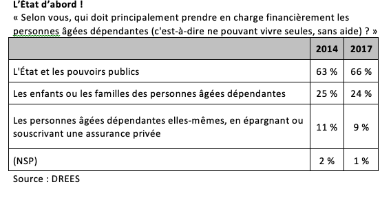 Si les Français aspirent, au grand-âge, à demeurer physiquement dans la sphère privée qu’ils ont pu se constituer, ils demandent, à tout âge, un effort accru de la sphère publique pour mieux traiter de la dépendance. Ils sont majoritaires à estimer que c’est à l’État et aux pouvoirs publics en général de prendre en charge financièrement les personnes âgées dépendantes. La question n’est posée que depuis 2014 et on ne saurait noter trop de variations sur cette période. Ce sont ainsi deux tiers des répondants qui avancent la nécessité d’une prise en charge principalement publique des dépendants. Ils ne sont qu’un quart à penser que la responsabilité en incombe d’abord aux descendants et à la famille des personnes qui ne pourraient plus vivre seules sans aide. Enfin, un Français sur dix répond que c’est aux individus concernés de s’assurer et de prévoir.