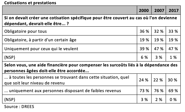 Sur le plan de l’épargne personnelle, le questionnaire interroge, depuis 2000, sur ce que les Français seraient prêt à faire. On ne leur demande pas une mesure de leur effort possible, mais simplement de dire s’ils pourraient davantage épargner en prévision d'une éventuelle situation de dépendance les concernant. En la matière, on doit relever une majorité de personnes prêtes à épargner plus, mais avec une certaine érosion, dans le temps, de cette proportion. Du côté des Français qui ne se disent pas prêts – soit qu’ils n’en aient pas les moyens, soit qu’ils n’en voient pas les fondements – à le faire, la proportion passe du quart des répondants au début des années 2000 à presque 40% en 2017. C’est une autre des transformations importantes, dans le temps, de l’opinion.