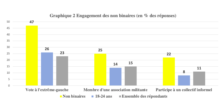 En faible nombre, mais bien organisés sur les réseaux sociaux et les sites communautaires, les non binaires constituent un ensemble rebelle et actif. En France, ils votent deux fois plus souvent à l’extrême gauche (47%) que le reste de l’échantillon (23%). Ils sont plus souvent engagés dans une association militante (25%) que le reste de l’échantillon (15%) et les 18-24 ans (14%) ; de même ils sont deux fois plus engagés dans un collectif informel (22%) que les autres (11%), en particulier que les 18-24 ans (8%) (Graphique 2). En Allemagne, ils votent aussi trois fois plus pour l’extrême-gauche (18%) que le reste de l’échantillon (5%), et nettement plus que les 18-24 ans (7%) ; ils sont aussi, comme en France, plus engagés que l’ensemble des répondants et que les autres jeunes dans une association militante ou un collectif informel.