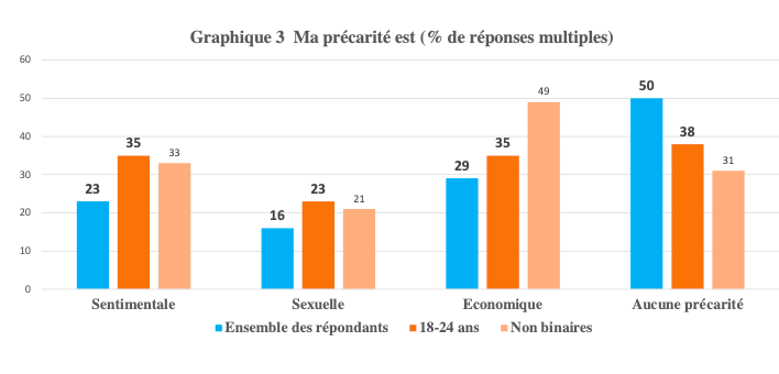 De fait, le principal problème auquel sont confrontés les non binaires qui ont répondu à l’enquête est celui de l’insertion économique. Ils se présentent deux fois plus souvent en galère que la moyenne de l’échantillon (16% contre 8%) et, comme le montre le graphique 3, la moitié d’entre eux ressent une précarité économique contre 29% de l’ensemble des répondants et 35% des 18-24 ans. Les discriminations dont ils peuvent faire l’objet renforcent sans doute leur difficulté à s’insérer économiquement. Parallèlement, leur précarité sentimentale ou sexuelle n’est guère différente de celle des personnes du même âge – toutes deux plus importantes que la moyenne des répondants.