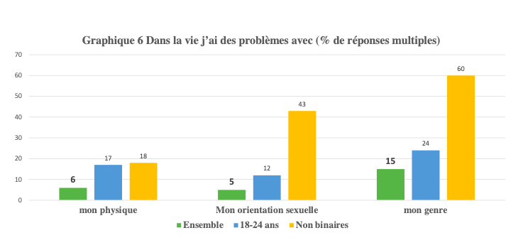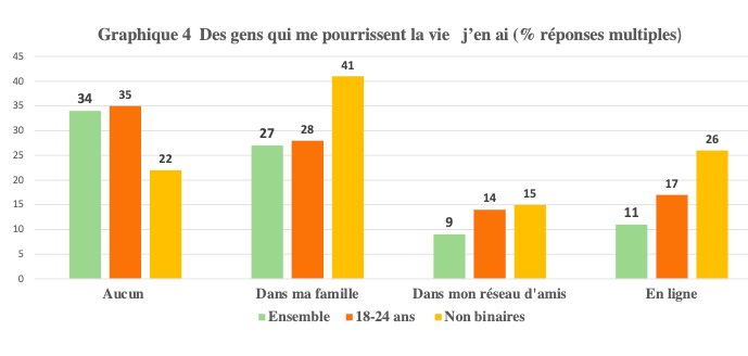 De même, les non binaires se trouvent, beaucoup plus que l’ensemble des répondants, et même des 18-24 ans, confrontés à des difficultés relationnelles d’ordre familial ou dans leurs navigations internet. Par contre, ils rencontrent rarement des problèmes avec leurs réseaux d’amis, à l’image des autres jeunes de 18-24 ans (graphique 4).