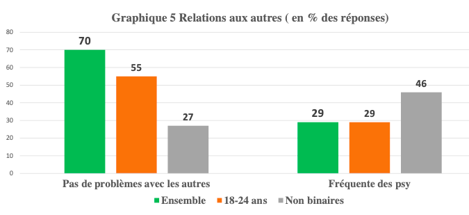Ces complications relationnelles, au total, les caractérisent et les conduisent alors à être des habitués des psychologues et psychiatres, plus que la moyenne des répondants et plus que la moyenne des 18-24 ans (graphique 5).