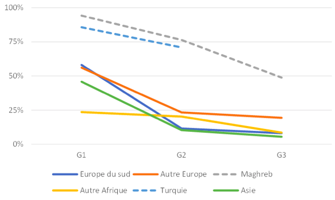 Lecture : parmi les personnes originaires du Maghreb, la part de prénoms spécifiques (« arabo-musulmans ») passe de 94% (G1) à 76% (G2) puis 49% (G3), d'après la nomenclature de l'INED.