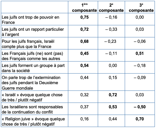 Une analyse en composantes principales des réponses aux neuf questions qui portent sur les attitudes à l’égard des juifs et d’Israël permet de répondre à la question, très présente aujourd’hui, du rapport entre ces différentes attitudes (tableau 1). « L’analyse dégage trois facteurs d’organisation des réponses ou composantes écrivent les auteurs. Tous les indicateurs entrés dans le modèle contribuent positivement au premier facteur. Il existe bien un univers cohérent de préjugés antisémites, accumulés au fil des siècles. » Les éléments qui contribuent le plus (en gras) à cette première dimension, comme en témoignent les coefficients correspondants, sont les clichés traditionnels du « vieil » antisémitisme : la croyance en un pouvoir excessif des juifs, leur rapport supposé à l’argent, le refus d’y voir des Français comme les autres, leur « double allégeance » à Israël et à la France, leur communautarisme. Cet antisémitisme traditionnel est d’origine chrétienne[1].