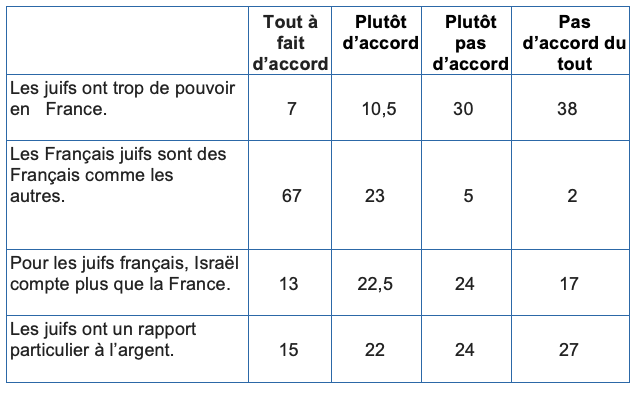 « Les scores élevés sur la première dimension, celle du vieil antisémitisme, vont de pair avec un faible niveau d’instruction, le sentiment de vivre moins bien qu’avant, une résidence en zone urbaine et plus particulièrement dans l’agglomération parisienne, un positionnement de droite ou d’extrême droite, un faible intérêt pour la politique, une vision intolérante et autoritaire du monde (rejet des immigrés, des droits des femmes et des personnes LGBT, autodéfinition de soi comme raciste, défense de la peine de mort, etc.). Ce vieil antisémitisme, comme observé dans l’enquête de mai dernier, est également très marqué aujourd’hui chez les musulmans (0,91).