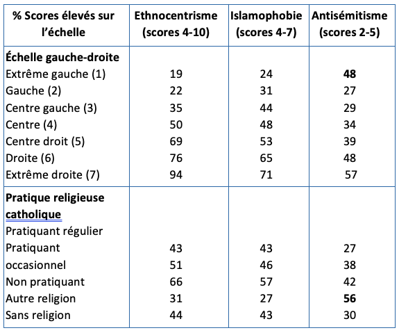 Cependant, cette concordance entre les trois préjugés présente deux exceptions remarquables qui concernent la variable religieuse et la variable politiques (tableau 3). Sur ces deux variables, l’antisémitisme se distingue en effet des deux autres préjugés.