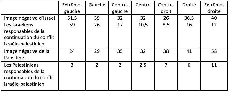 Symétriquement, l’image de la Palestine est d’autant plus négative que l’on se déplace de la gauche vers droite. Enfin les Palestiniens ne sont pratiquement jamais tenus pour responsables de la continuation du conflit.