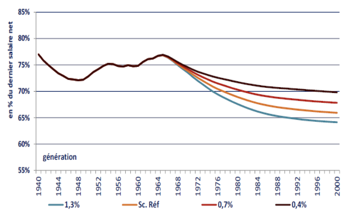 Pourrait-on remettre tout cela dans le bon sens ? Trouver la modulation adéquate du taux de remplacement soulève un problème d’anticipation car c’est en fonction de la croissance future qu’il faut la calculer. Si on parie sur une croissance forte qui n’est pas au rendez-vous, on aura initialisé les pensions à un niveau qui restera trop élevé pour l’enveloppe dont on dispose. Ceci obligera soit à revoir l’enveloppe à la hausse, si les cotisants en sont d’accord, soit à ajuster par l’âge, si les personnes sur le point de partir en sont également d’accord, soit à renier l’engagement initial de maintien du pouvoir d’achat tout au long de la retraite des individus qui sont déjà partis. Rien n’est donc acquis, mais le problème serait quand même moindre qu’avec des taux de remplacement actuels qui, parce qu’ils vont à contre-courant de cette logique, amplifient à l’excès ces besoins de correction ex post.