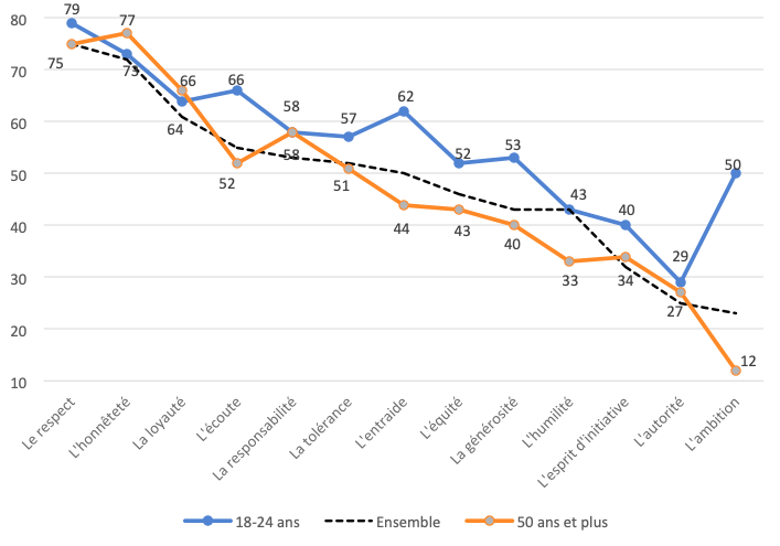 D’ailleurs une des qualités mises en avant par les jeunes et sur laquelle ils se distinguent massivement des adultes est l’ambition. Ce résultat est d’autant plus notable que l’ambition est souvent connotée négativement. L’ambitieux peut être perçu comme quelqu’un qui veut écraser les autres pour réussir et dans un pays catholique comme la France l’ambition et la réussite ont souvent été dénigrées pour ces raisons. Mais les jeunes – et c’est une bonne nouvelle – semblent étrangers à cette image négative et pensent possible de conjuguer la réussite individuelle et l’ambition qui l’accompagne avec des valeurs comme la générosité, l’entraide et l’équité.