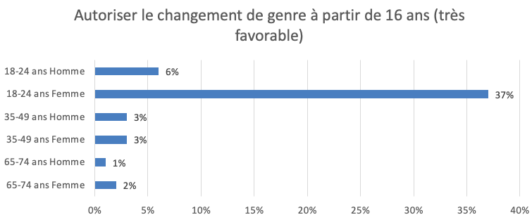 Sur des questions relatives au genre, assez clivantes, présentées à la figure 2, les jeunes femmes se démarquent radicalement par leur adhésion incomparablement plus forte à l’idée de la liberté de choisir son sexe. Il est rare dans les enquêtes sociologiques de trouver des écarts aussi importants. Ils traduisent ici une forte évolution générationnelle, mais qui est principalement portée par les femmes. Il faudra attendre d’autres enquêtes pour voir si ces tendances se confirment en France. Si elles le font, c’est une évolution considérable qui verrait pour la première fois les femmes se distinguer radicalement, sur des questions de mœurs, du reste de la population. Il faudra pendre la mesure de ce bouleversement qui ne manquera pas d’avoir des conséquences sur les rapports entre les sexes.