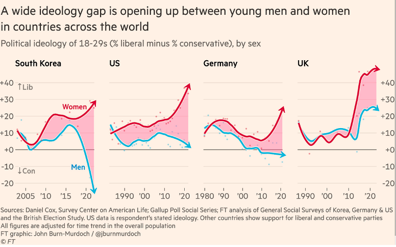 Ce mouvement de déconnexion idéologique des jeunes hommes et des jeunes femmes semble constituer une tendance mondiale. Le Financial Times[3] a rendu compte de travaux du Survey Center on American Life et de ceux d’une chercheuse de Stanford, Alice Evans, qui montrent que, dans de nombreux pays, y compris des pays non occidentaux comme la Corée du Sud, cet écart a commencé à se creuser au début des années 2010 et n’a fait que s’accroître depuis.