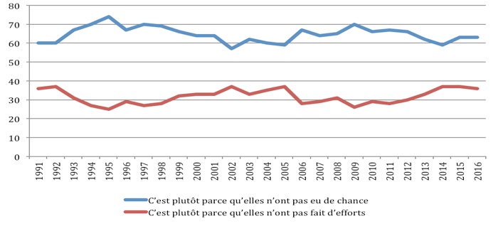 Cette compréhension, il est vrai, s’érode. En 2014 encore, l’opinion selon laquelle « les personnes qui vivent dans la pauvreté n’ont pas fait d’effort pour s’en sortir » est également à son niveau le plus élevé depuis que la question est posée (à 37% contre 25% par exemple au lendemain de la crise de 2008). Certes l’opinion selon laquelle c’est plutôt parce qu’elles n’ont pas eu de chance demeure elle-aussi majoritaire (59%) – signe de l’option toujours solidaire des Français – mais elle fléchit. Sans toutefois rompre.