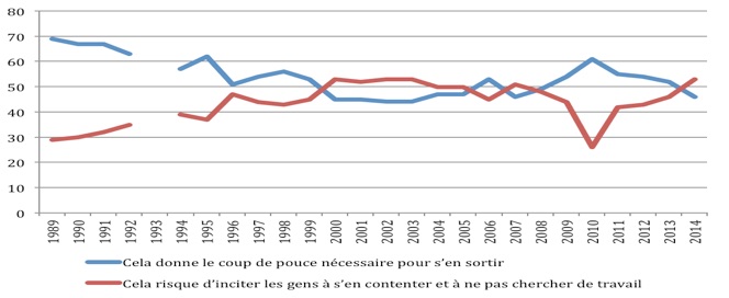 À l’époque, ce durcissement des attitudes à l’égard d’aides et de dispositifs considérés comme désincitatifs à l’exercice d’une activité n’était certainement pas sans rapport avec la diffusion de l’idée que le marché de l’emploi redémarrait alors. C’est donc bien probablement dans le recul même du chômage que se trouvaient les raisons de ces évolutions. En tout état de cause la corrélation était au cœur des analyses. Or, en période bien plus défavorable, au moins sur le seul plan de l’emploi, ces critiques sont tout aussi présentes, notamment au sujet du RSA. Comme pour la compréhension exprimée à l’égard des pauvres, la critique de la désincitation n’est pas d’abord conjoncturelle. Les Français sont solidaires à l’égard des pauvres, critiques vis-à-vis des mécanismes de type minima sociaux, non pas dans leur essence mais dans leurs possibles effets pervers.